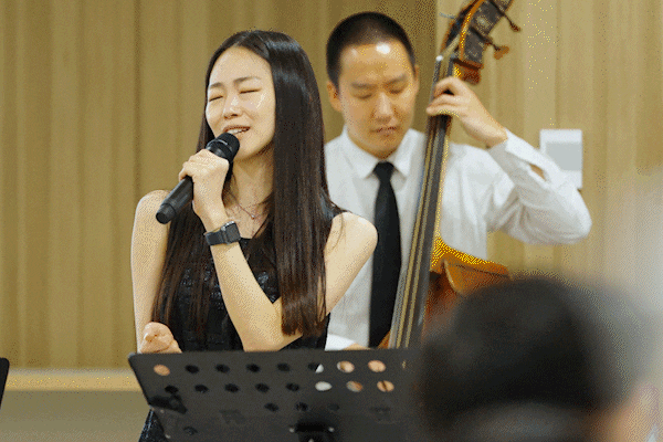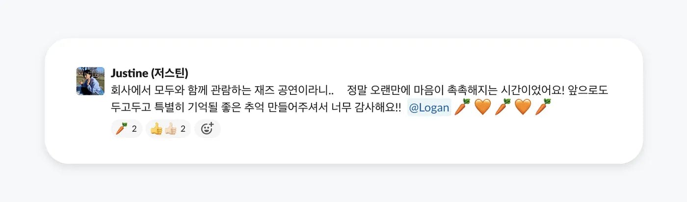 8월의 어느 날 공연은 오가람쿼텟 재즈밴드가 맡아주었어요. 보컬, 피아노, 베이스, 기타까지, 다양 한 선율이 당근마켓 사무실을 가득 채웠답니다. 모두가 다 함께 따라 부를 수 있을 만한 ‘Can’t take my eyes off you’부터 ‘재즈란 말이죠’로 유명해진 스캣까지, 한 소절씩 주고받으며 잊지 못할 시간을 만들었어요.