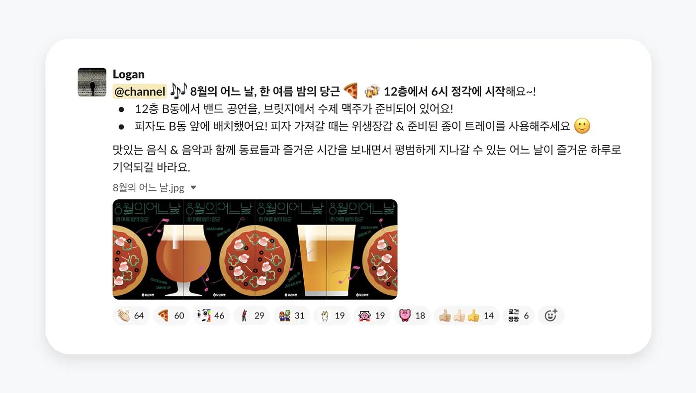 당근마켓 팀원들의 특별한 ‘어느 날’을 위해, 피플팀과 콥브랜딩팀이 머리를 맞댔어요. 5월의 어느 날이 워낙 큰 사랑을 받은 덕분에, 부담이 크기도 했는데요. 고민 끝에… 상상하지도 못한 규모의 ‘어느 날’이 등장했습니다. 바로 재즈와 맥주를 곁들인 어느 날을 만들어보기로 한 것! 이름하여 한여름 밤의 당근. 🍻🎶