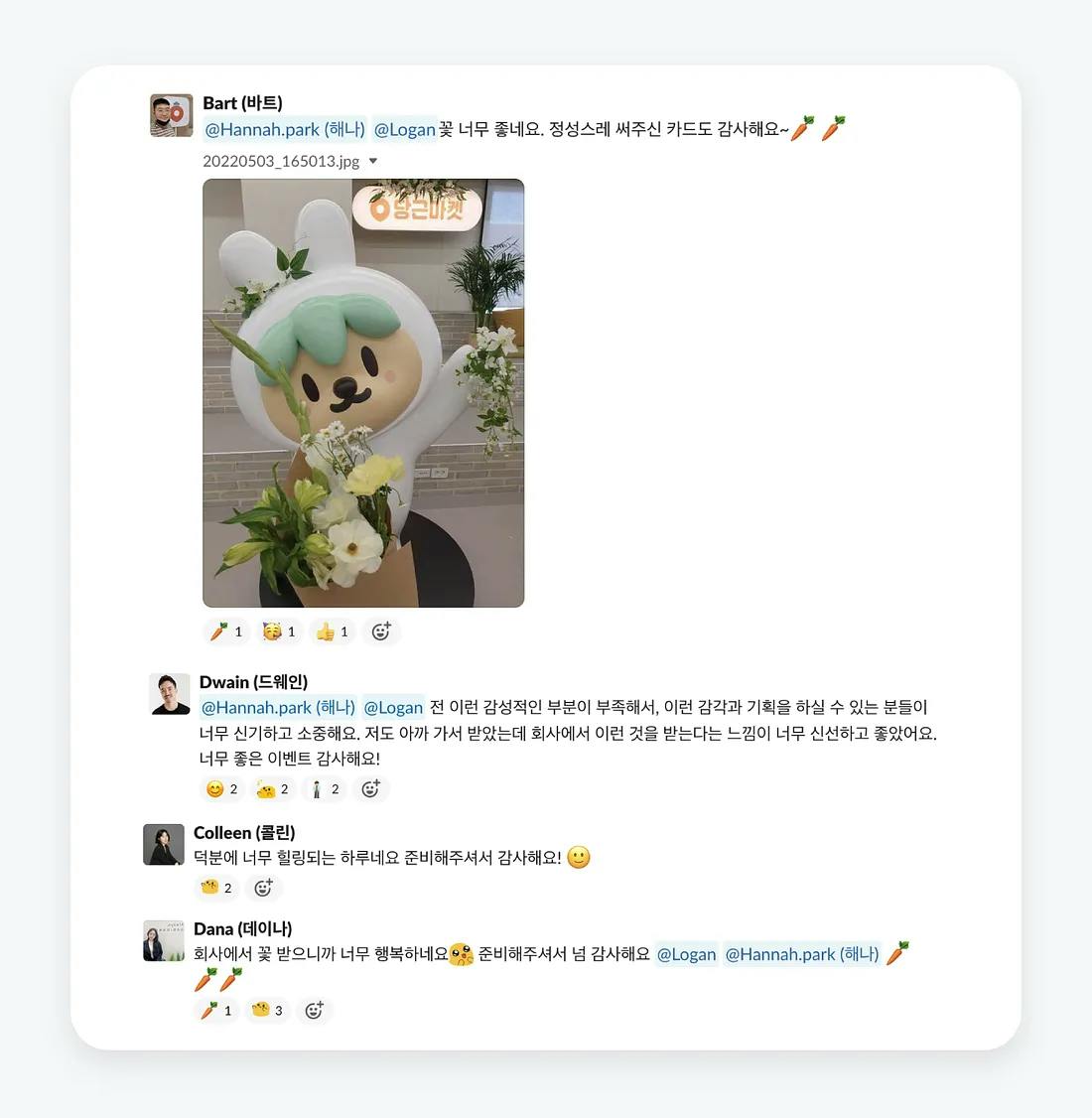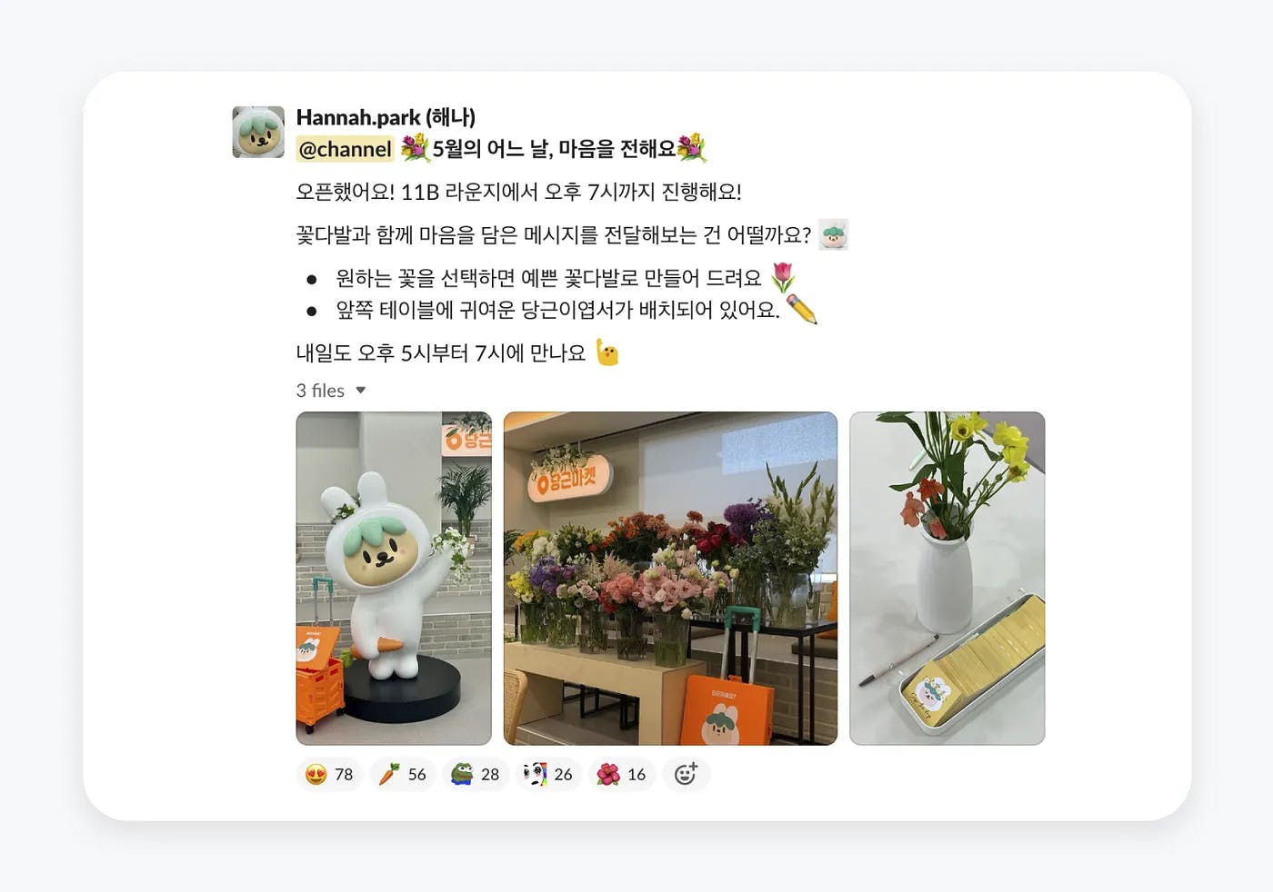 5월의 ‘어느 날’ 행사는 이틀 동안 열렸어요. 팀원들이 원하는 꽃을 고르면, 예쁜 꽃다발을 받아볼 수 있었답니다. 꽃과 함께 마련된 당근이 엽서에는 선물하고 싶은 사람에게 편지를 쓸 수도 있었어요.