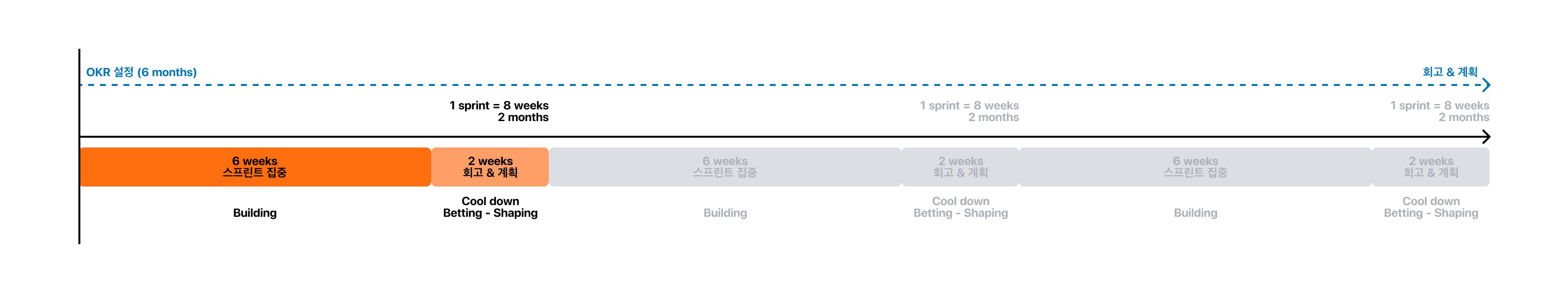 당근 운영실의 스프린트는 8주 단위로 진행돼요. 올해부터 반기 단위로 OKR을 설정하기로 해서, 반기마다 3개의 스프린트가 진행되는 꼴인데요. 8주 중에서 6주간은 스프린트 진행을 하며 팀에서 우선순위에 맞춰 진행하기로 한 업무를 진행해요. 나머지 2주는 미처 끝마치지 못한 일을 마무리하고, 이번 스프린트를 회고하고 다음 스프린트에 할 일을 정하는 기간이에요.