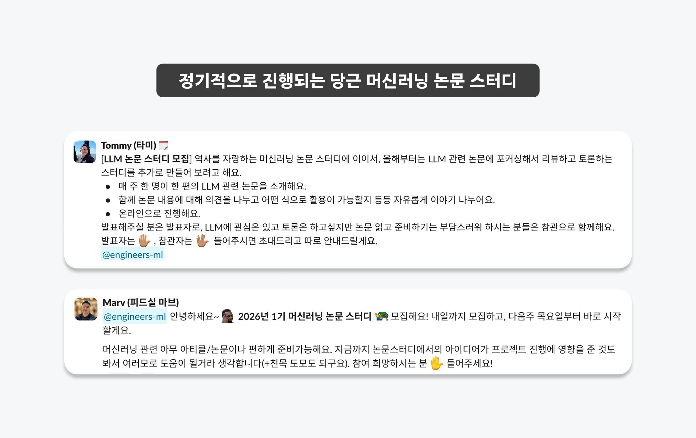 John: 함께 도메인 지식을 공부할 수 있는 분위기가 인상 깊었어요. 각 팀의 ML 엔지니어들이 모여 일주일에 한 번씩 논문 스터디를 열고 분야 제한 없이 인사이트를 나누거든요. 서로 설명하고 질문을 주고받으며 다른 팀의 고민과 새로운 접근을 자연스럽게 접하기도 해요. 도메인을 완벽히 몰라도 함께 배우며 성장할 수 있는 문화죠.